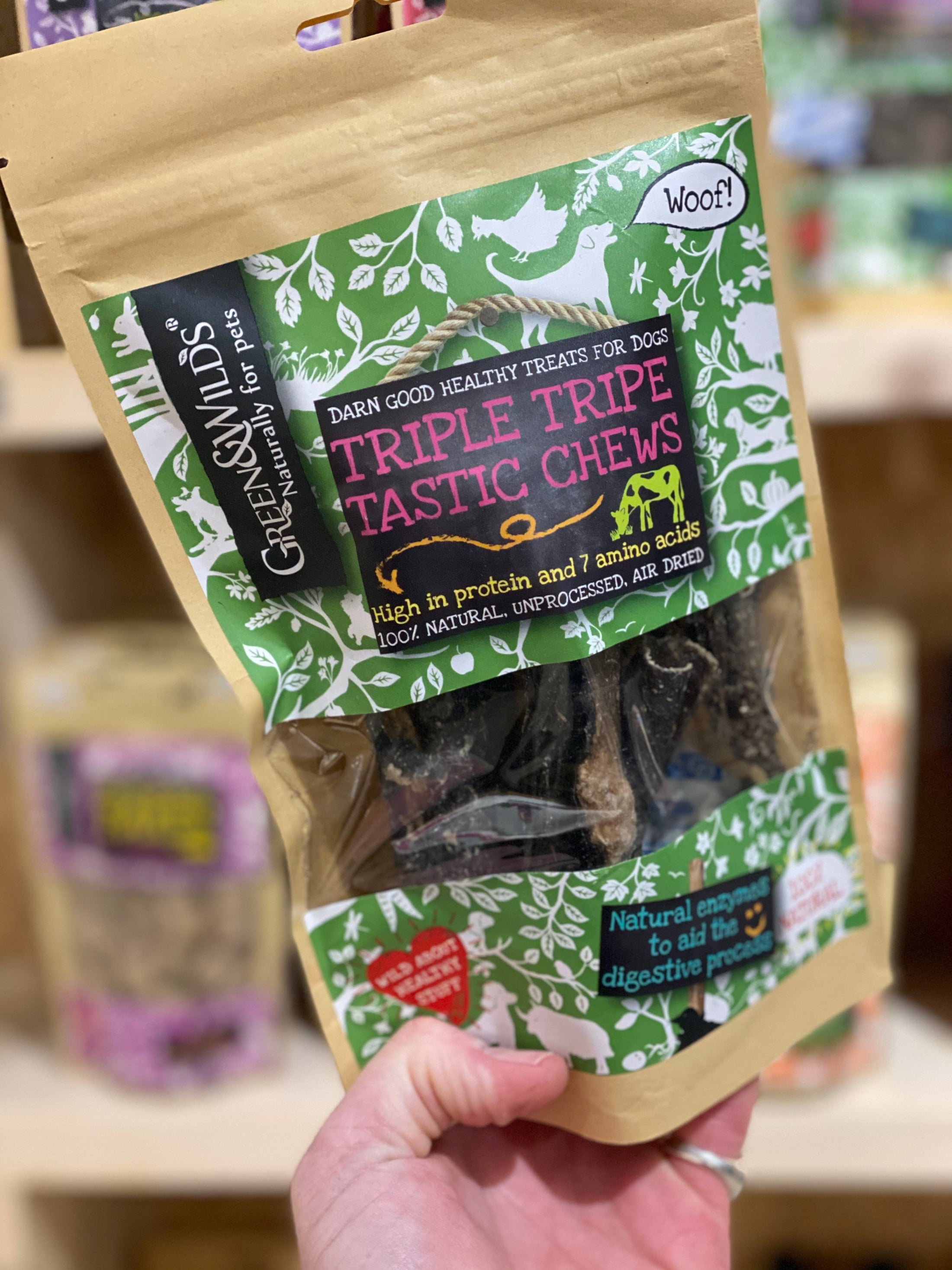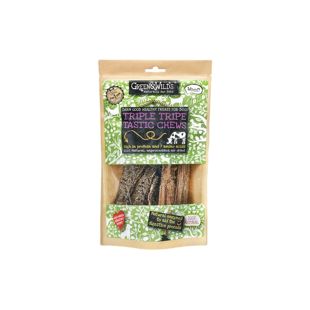 The Triple Tripe Tastic chews are natural "Green beef Tripe", unbleached, untreated and not boiled. It's highly nutritious, containing plenty of enzymes, good bacteria, and nutrients that are excellent for your pet's health.