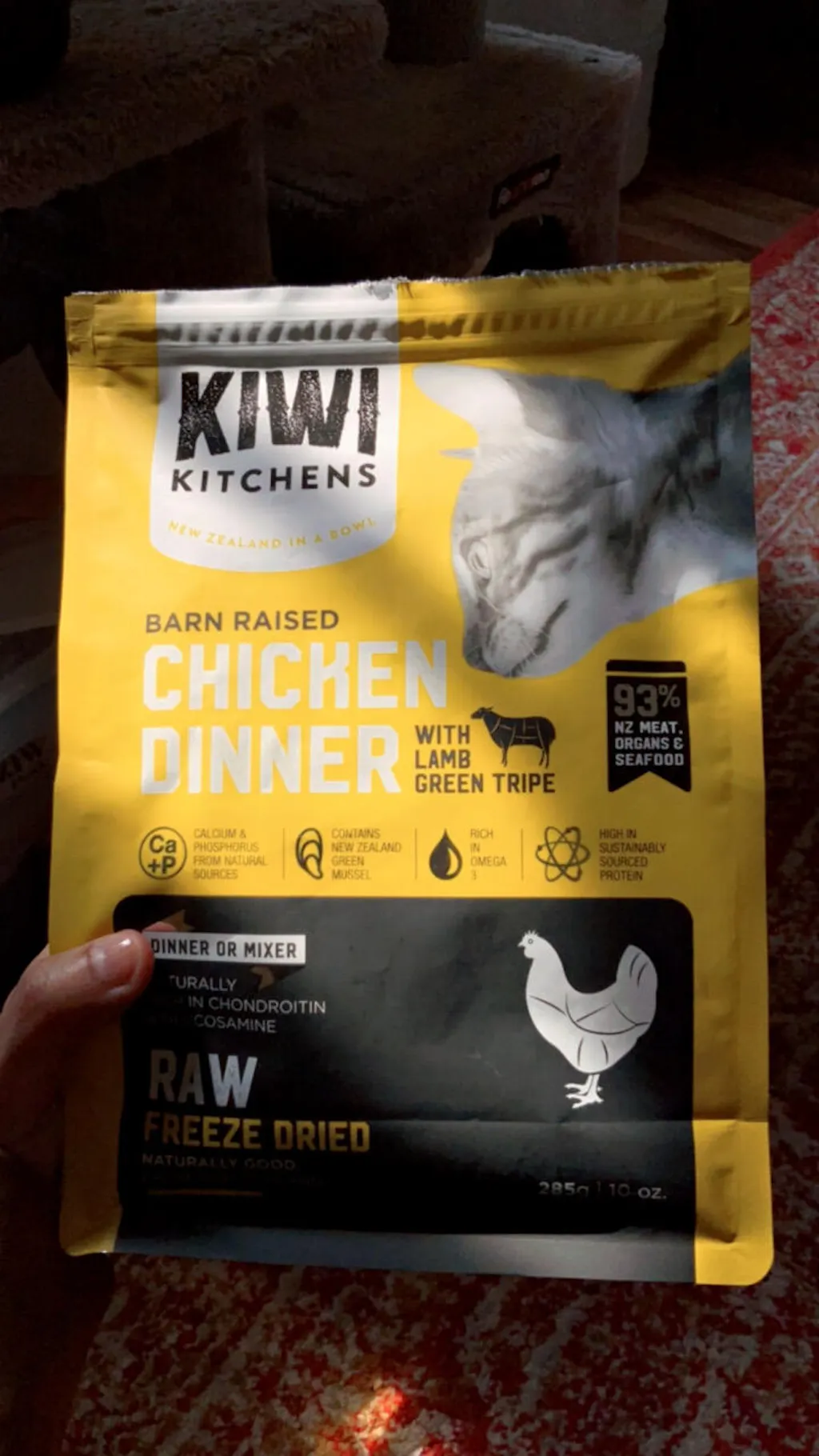 Kiwi Kitchens Barn Raised Chicken Dinner with Lamb Green Tripe is a high-quality freeze-dried raw cat food made from premium whole foods. All ingredients are ethically sourced from the pristine farms and waters of New Zealand. It’s designed to offer complete nutrition for cats of all life stages.